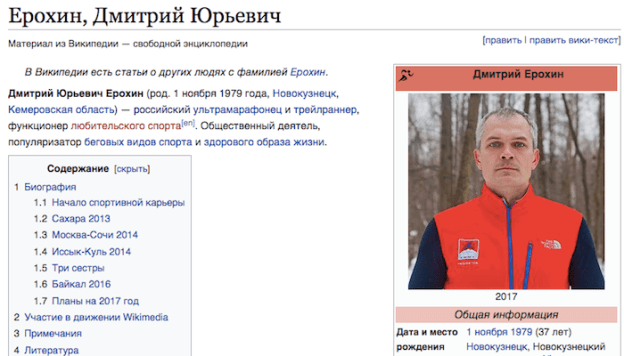 Статья о русском википедисте, ультрамарафонце-любителе и функционере любительского спорта Дмитрие Ерохине попала в Wikipedia.